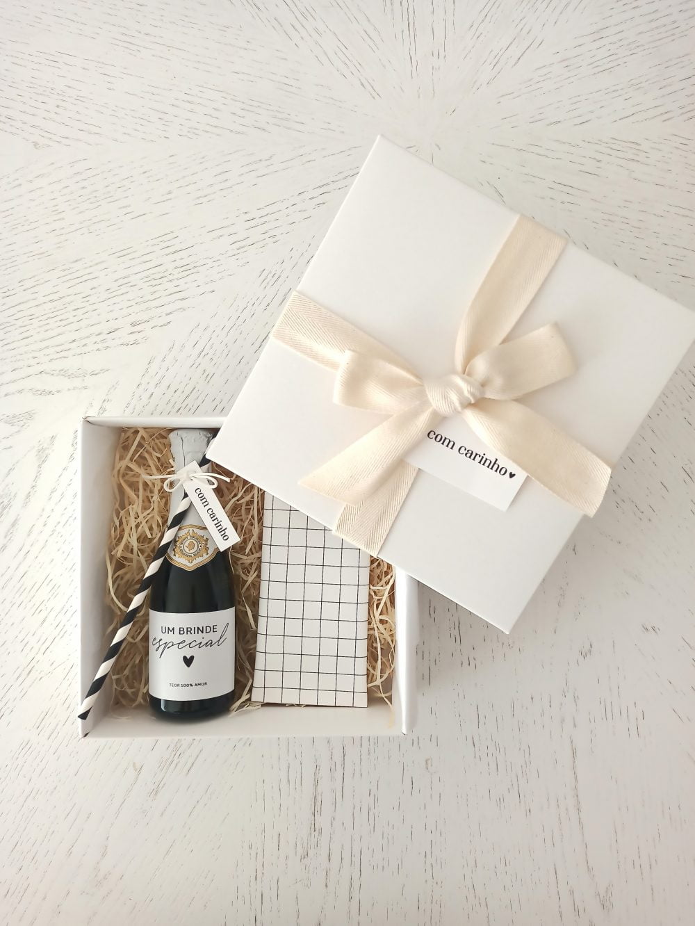 Acompanha forração em palha de madeira, fita de algodão cru e tag.