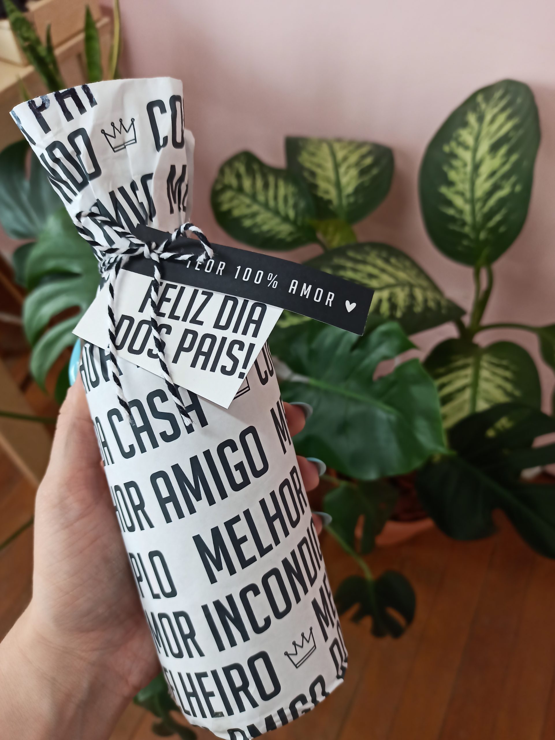 - Tag pendurada com fita (frase complementar como “com carinho” ou logo)