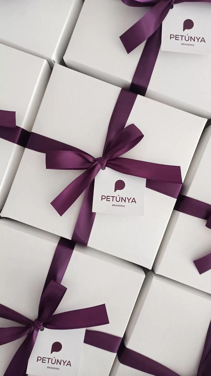• Caixa branca 20x20x10, forração papel premium, laço de cetim e tag