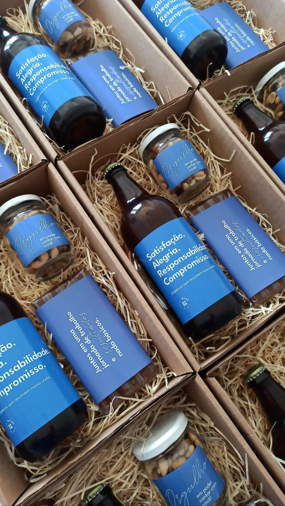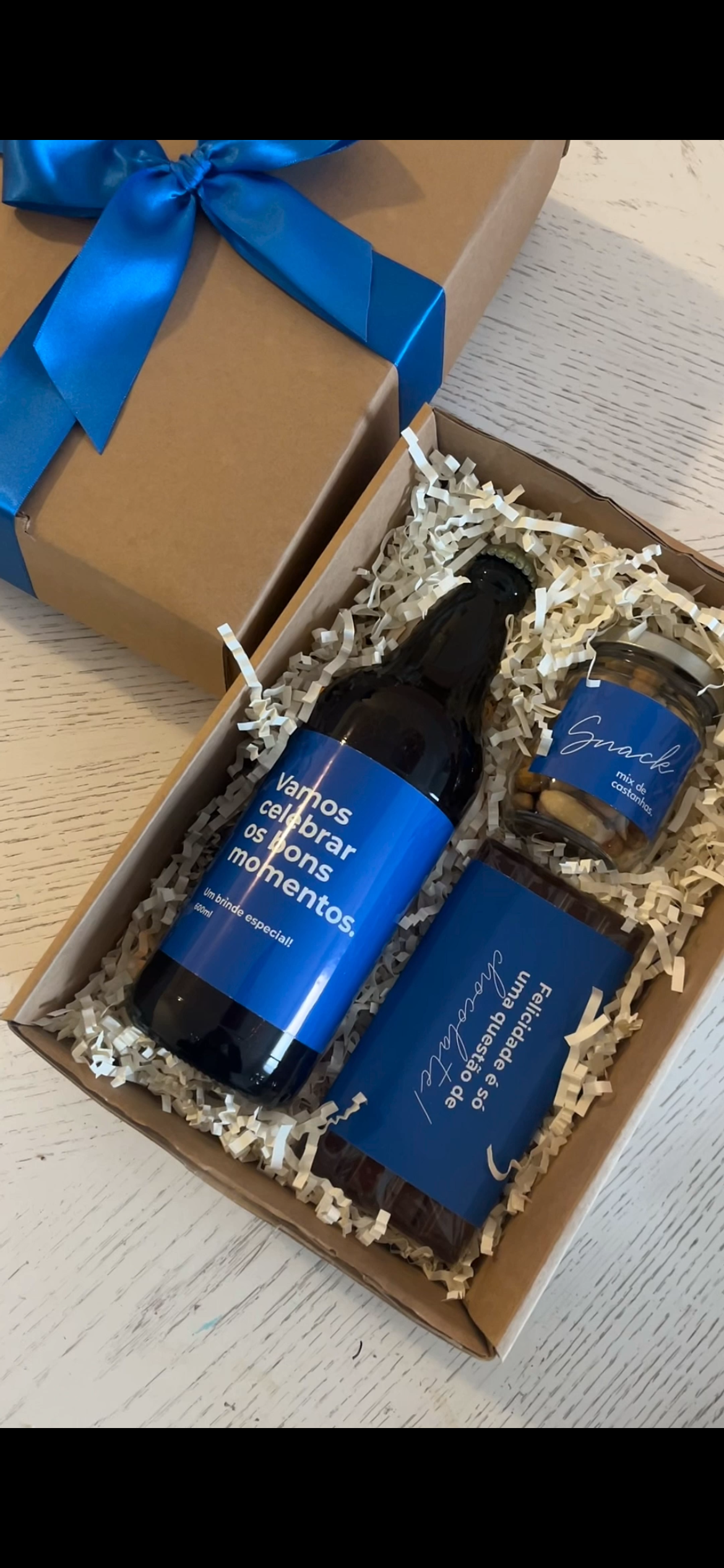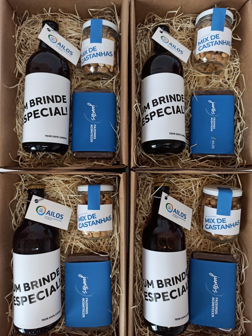Kit presente corporativo com cerveja premium, castanhas e chocolate artesanal. Brinde personalizado para colaboradores e clientes. A partir de 5 unidades. Entrega em todo o Brasil