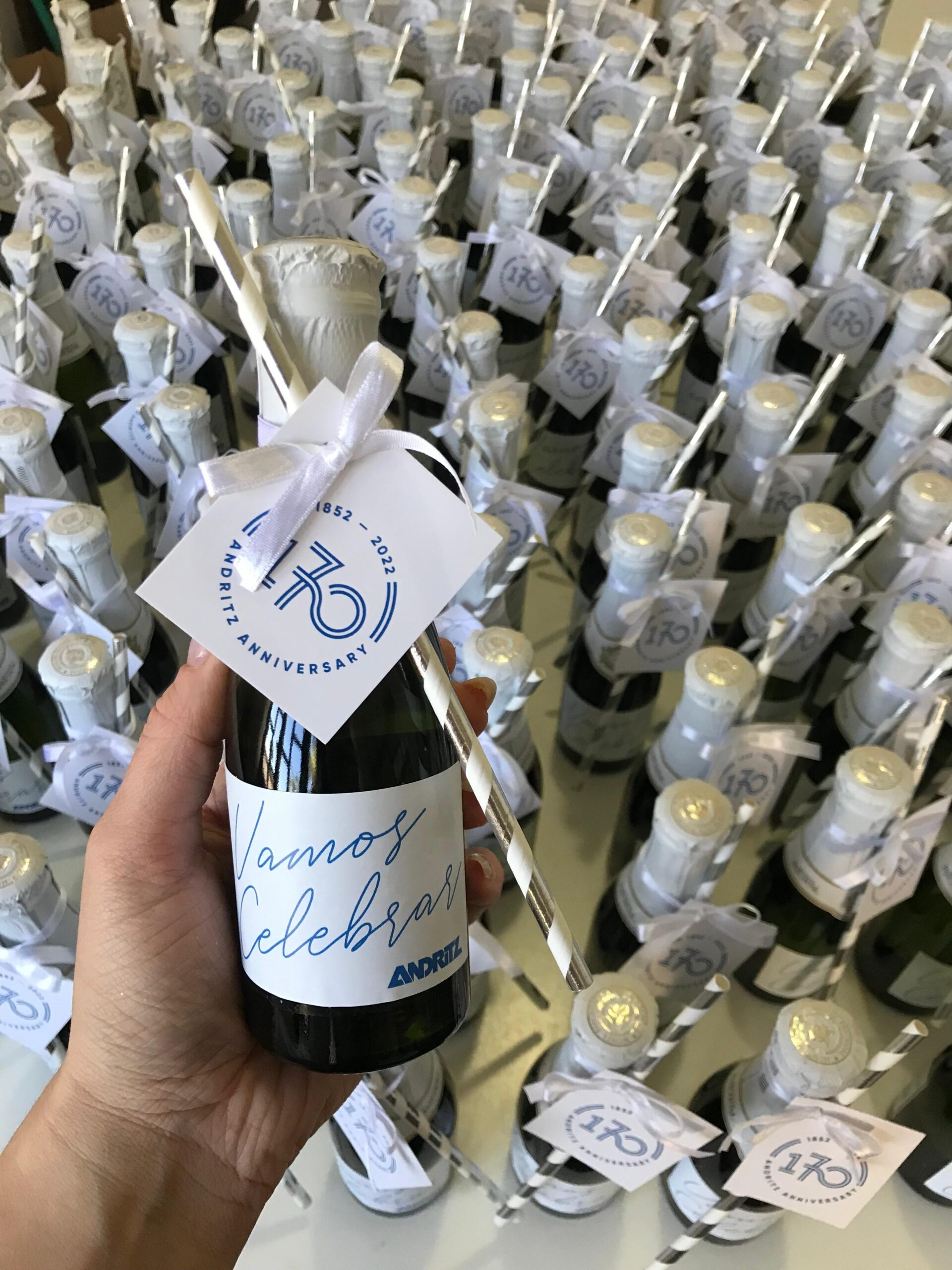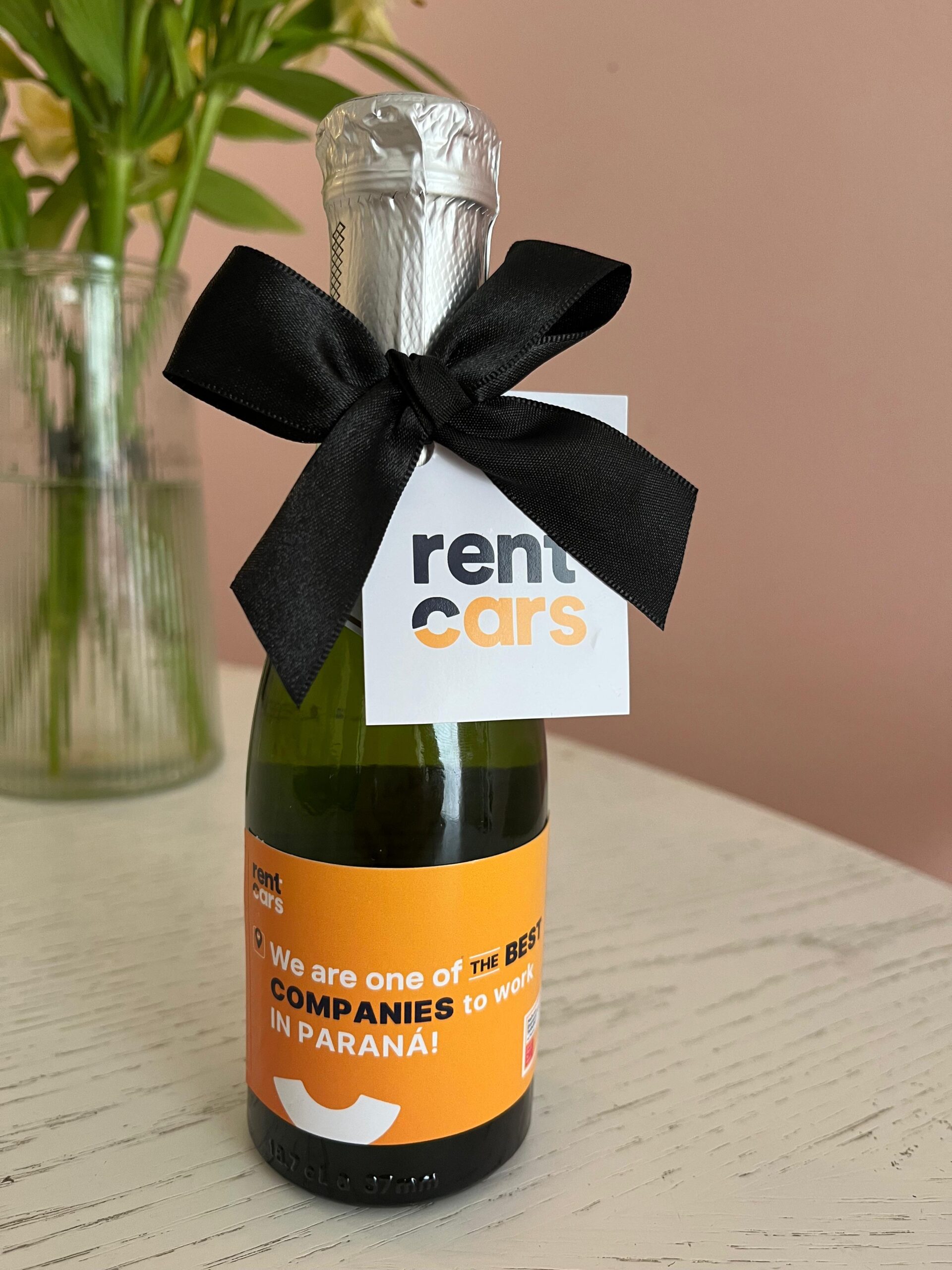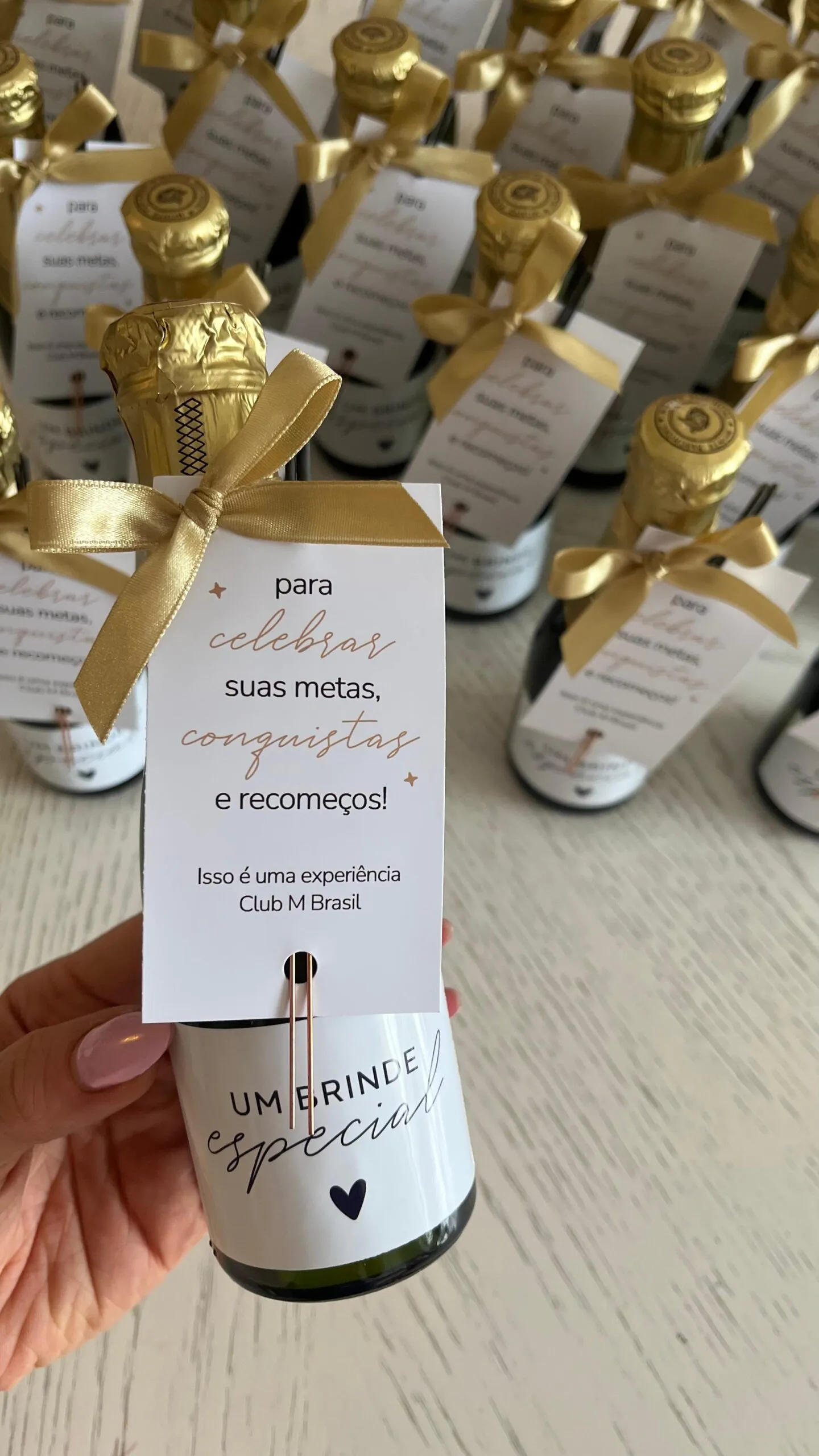 Mini espumante personalizado com adesivo e tag da sua empresa. Brinde corporativo prático e elegante. A partir de 5 unidades. Ideal para eventos, premiações e datas comemorativas. Entrega Brasil.