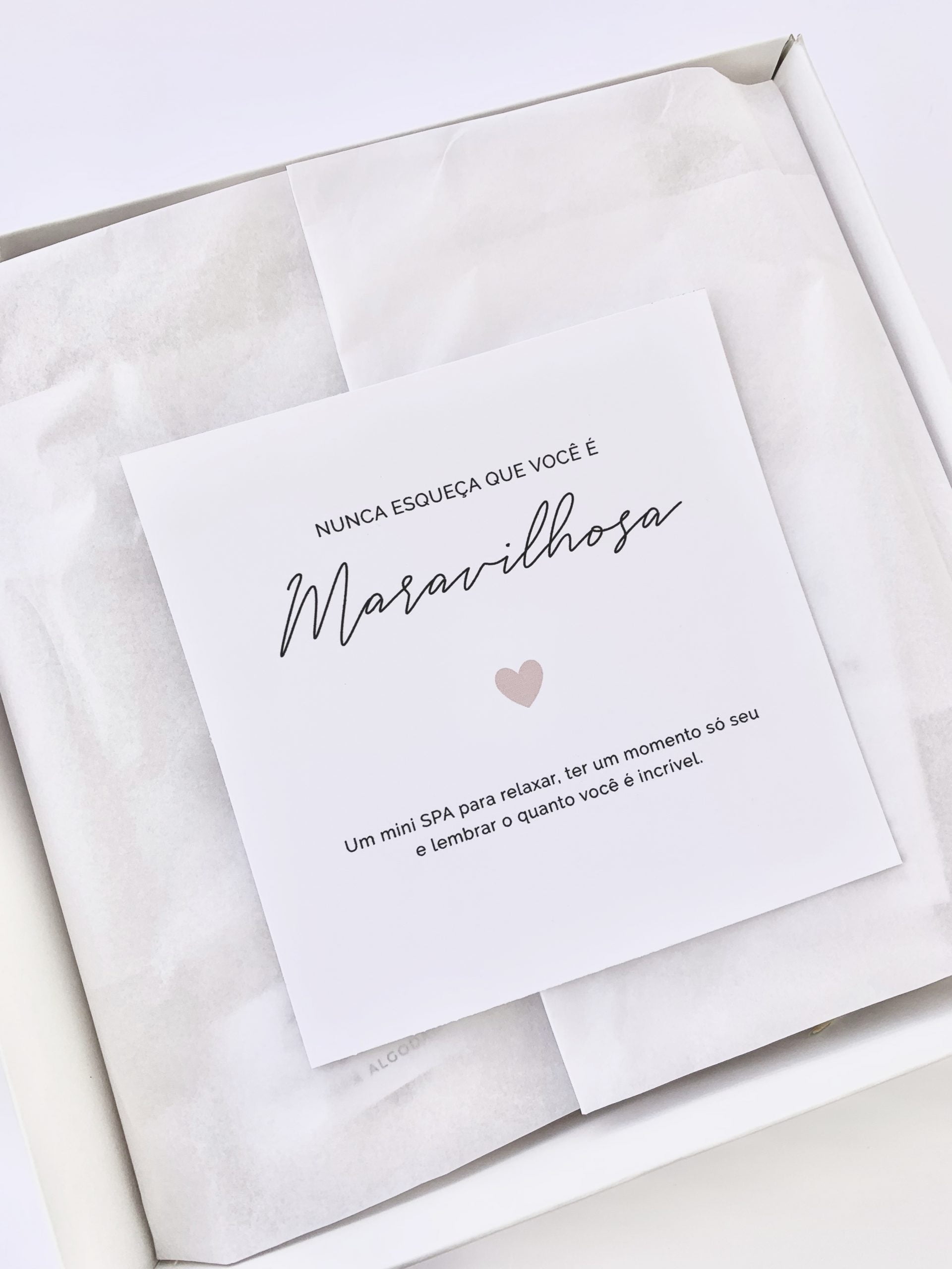 A caixa Mini SPA com Vela Perfumada é perfeita para um momento completo de pausa e relaxamento. Compre para um momento só seu ou para presentear uma pessoa especial. A caixa Mini SPA com Vela Perfumada inclui: