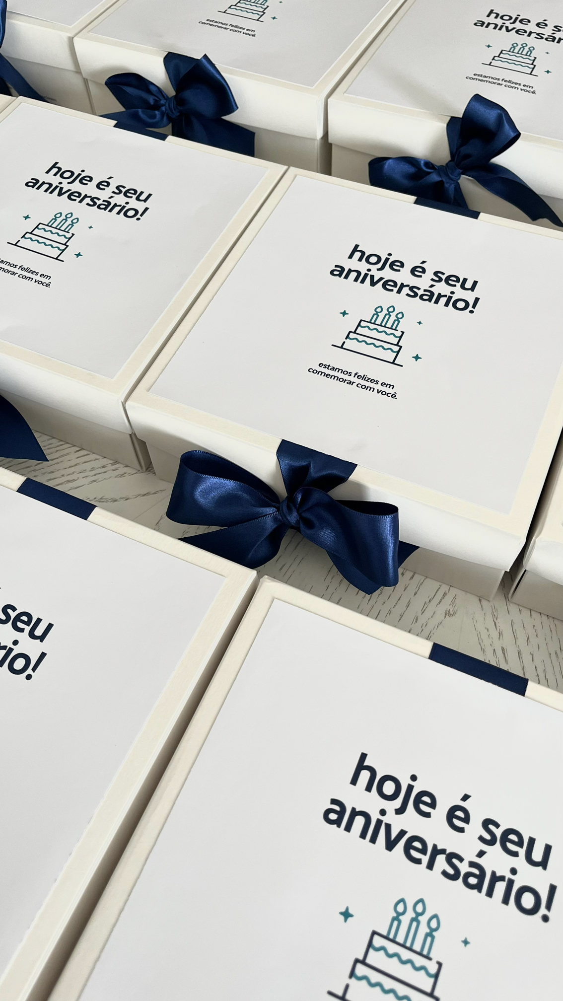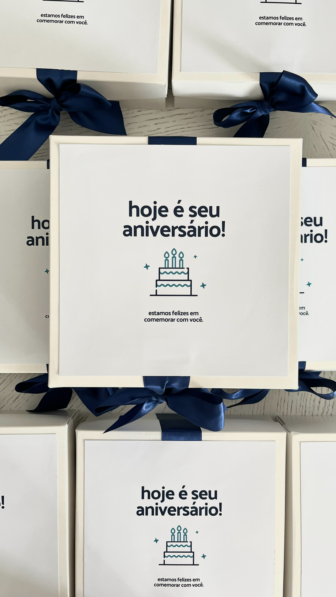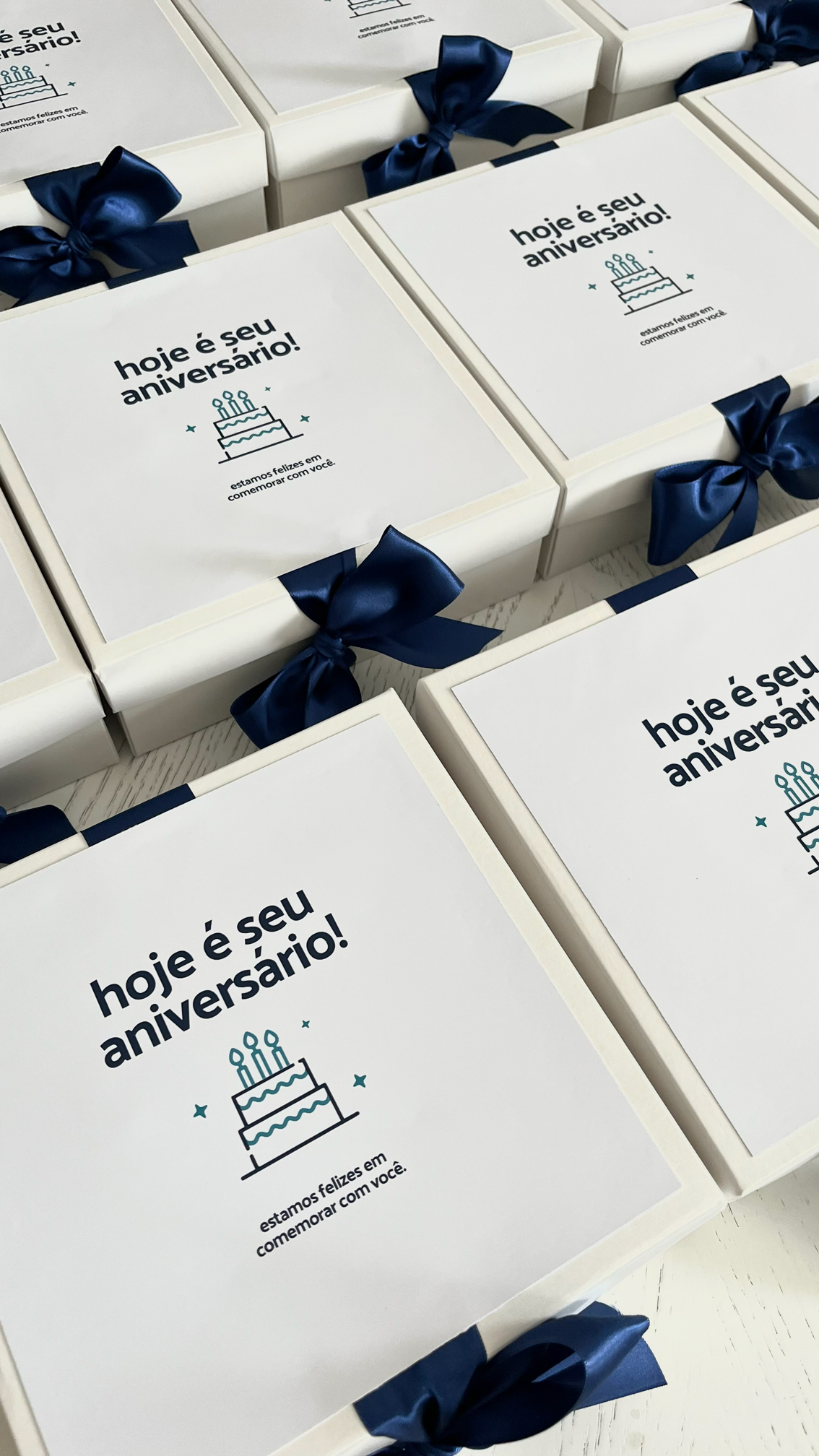 Kit presente de aniversário corporativo com snacks e embalagem personalizada. Celebre colaboradores com cuidado e criatividade. A partir de 5 unidades. Entrega em todo o Brasil.
